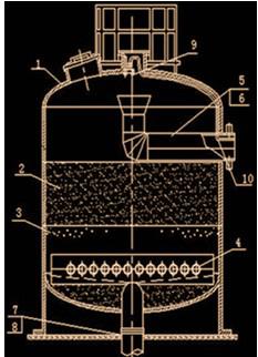 1-罐體;2-濾料層;3-墊料層;4-集配水管;5-進(jìn)水管;6-反沖洗排水管;7-出水管;8-反沖洗進(jìn)水管;9-自動(dòng)排氣閥;10-排氣管