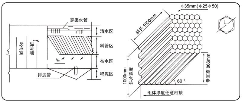 3. 當(dāng)斜管管長(zhǎng)為1米時(shí),有效負(fù)荷按3-5噸/米2·時(shí)設(shè)計(jì)。V0控制在2.5-3.0毫米/秒范圍內(nèi),出水水質(zhì)最佳。